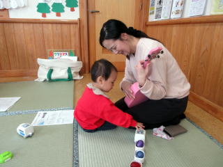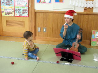 親子リトミックの後は、ウクレレ講習です。皆真剣です。「いい音だね***」