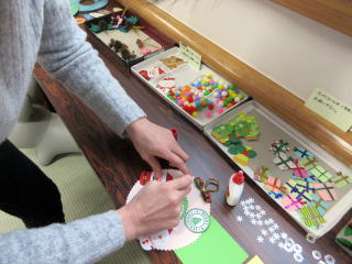 リボンやサンタさんを貼りますよ。 金や銀のかざりつけ。楽しいね。