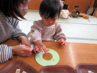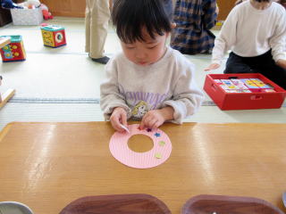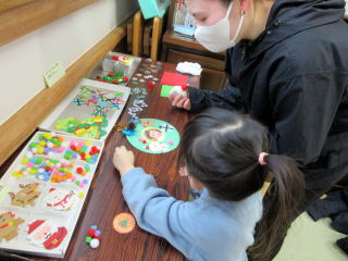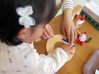 パーツを選んでリース作りです。 お姉ちゃんもお手伝いしたよ。