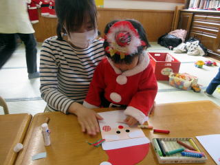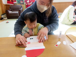 サンタのブーツを作ったよ。 目を貼って、口を貼って、貼るのが上手になったね。