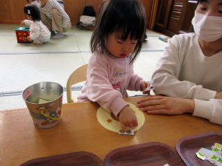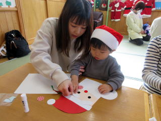 眉毛も貼ってね。 サンタは赤い鼻!ペタリ。