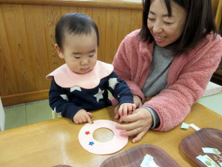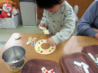 一つ、一つ、ゆっくり貼るよ。上手ね。 お星さまを考えて並べて貼ります。